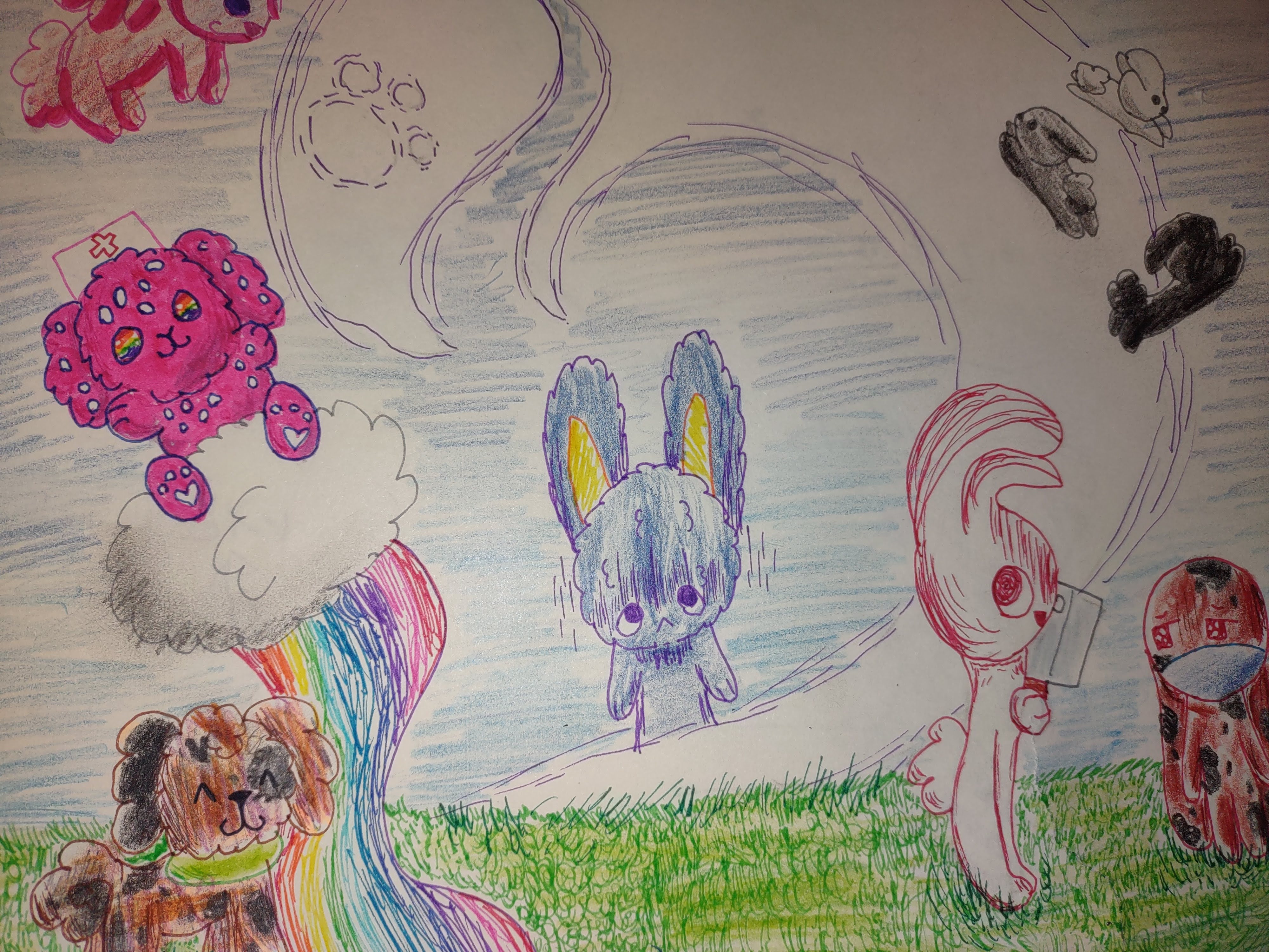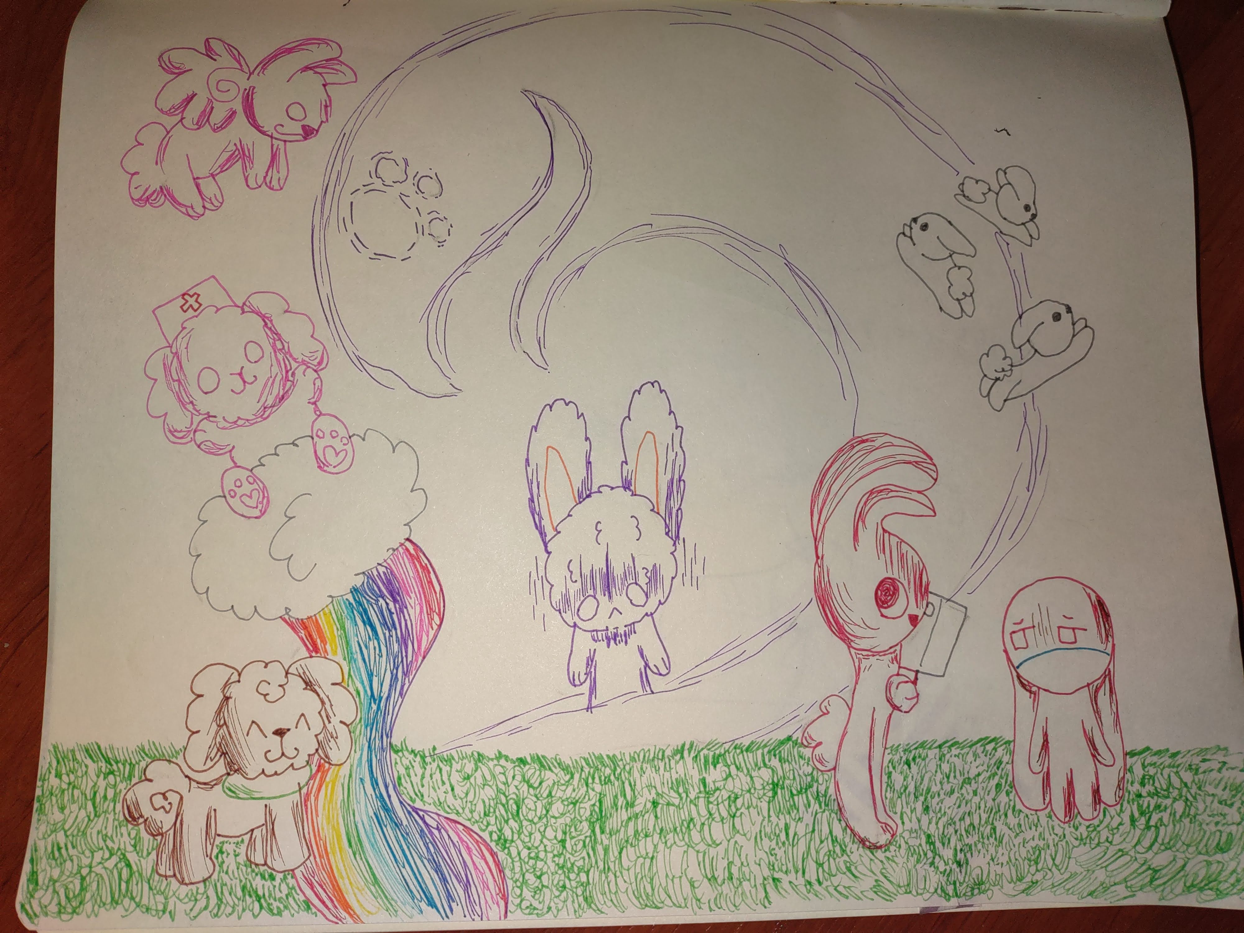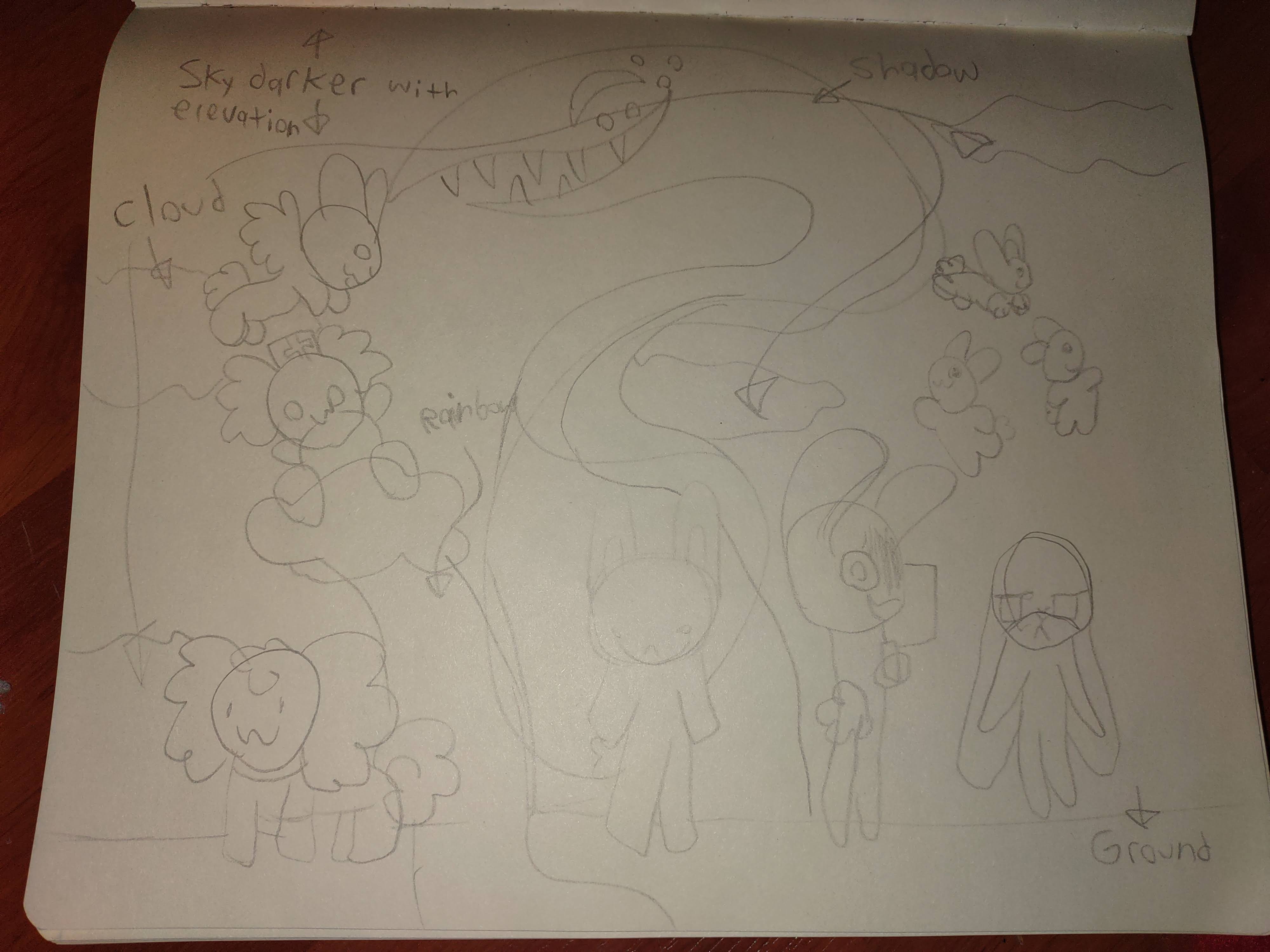 The second design [above] was to involve Patches, RGB, Magenta, Crumbs, the Monster, Ivory, Crimson and the baby bunnies all on one screen. This was the design I went with, as it was the most detailed and therefore best suited for a title screen where it is the first thing the player sees. There's actually a lot of allusion in this design [Crumbs in front of the Monster, Magentas wings, etc.].