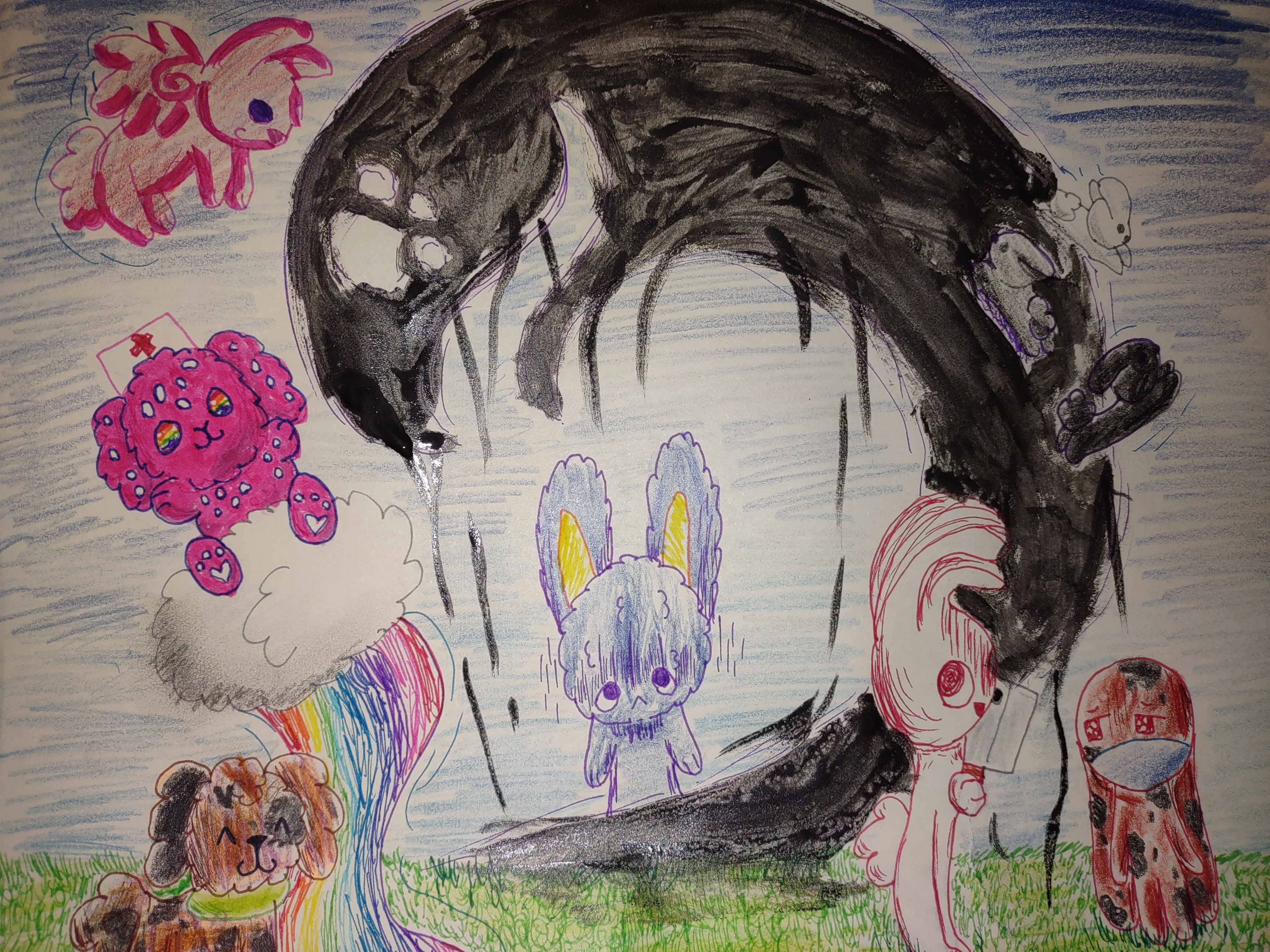 I finally added liquid graphite to fill in the Monster, and add some dripping "shadows". I also added lines to further improve the motion, and touched up some uncoloured parts. [above]. The final project also uses asymmetrical balance, I noticed. Crumbs and the Monster sit in the middle, 2 bunnies and the three baby bunnies sit on the right, and Patches and the 2 other bunnies sit at the left. [above].